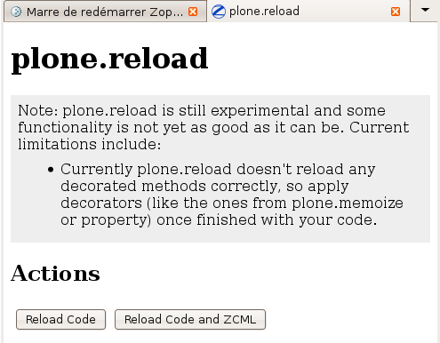 Attention: plone.reload reste expérimental et possède certaines limites, notament pour les méthodes décorées qui ne sont pas rechargées correctement.